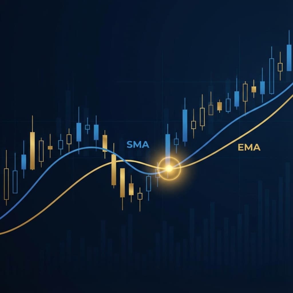 Master moving averages for trend identification. Learn SMA vs EMA, Golden Cross, Death Cross, and crossover trading strategies.